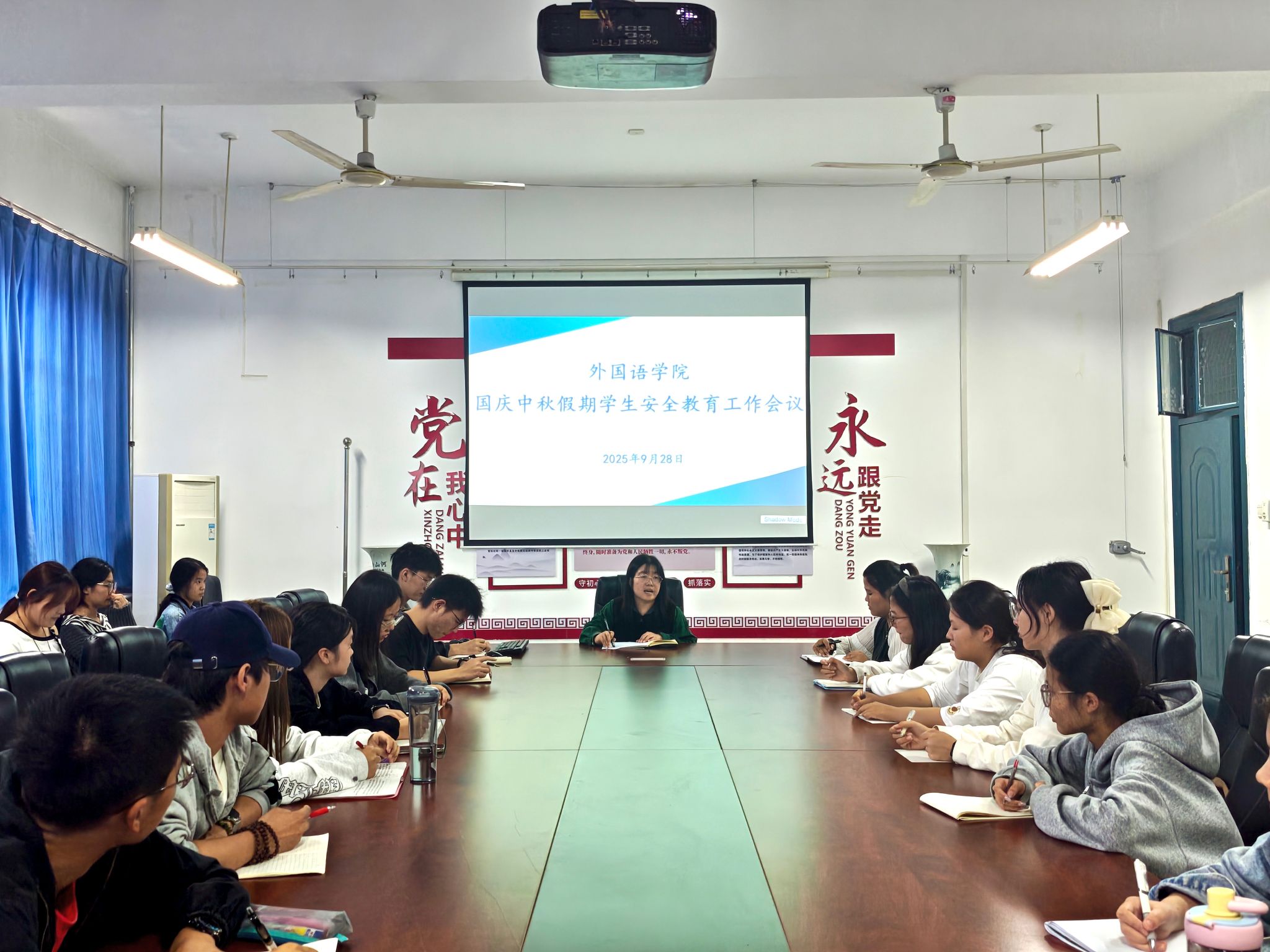 为传达学校及学院关于国庆中秋假期学生安全教育工作的相关会议精神,9月28日,外国语学院在7211会议室召开国庆中秋假期学生安全教育工作会议。外国语学院团委负责人以及各班团支书、班长以及25级新生代理班主任参加了此次会议。
