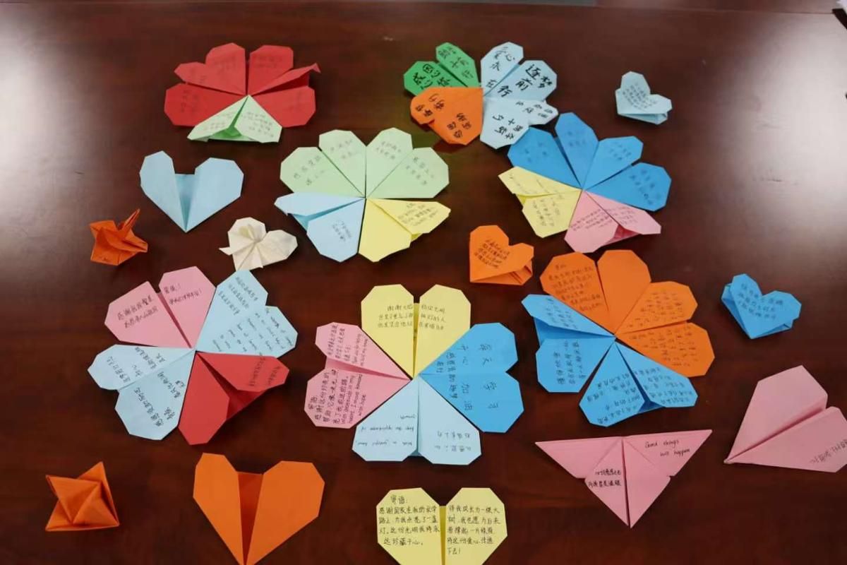 活动现场,彩纸在指尖翻飞,化成一颗颗真诚的心、一瓣瓣绽放的花。同学们提笔凝思,将受助的感激与对未来的期许郑重写下。一件件作品错落有致地铺展在桌上,五彩斑斓,方寸之间满载深情。这些寄语不仅是对关怀的回馈,更是“资助育人”成果的生动体现。