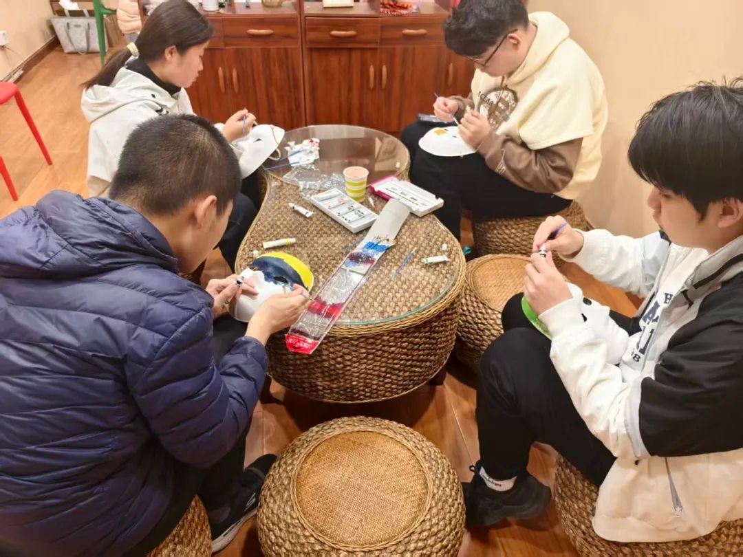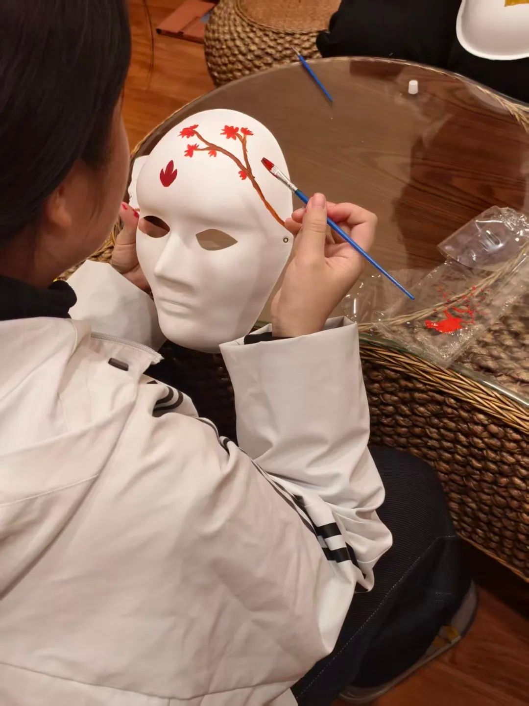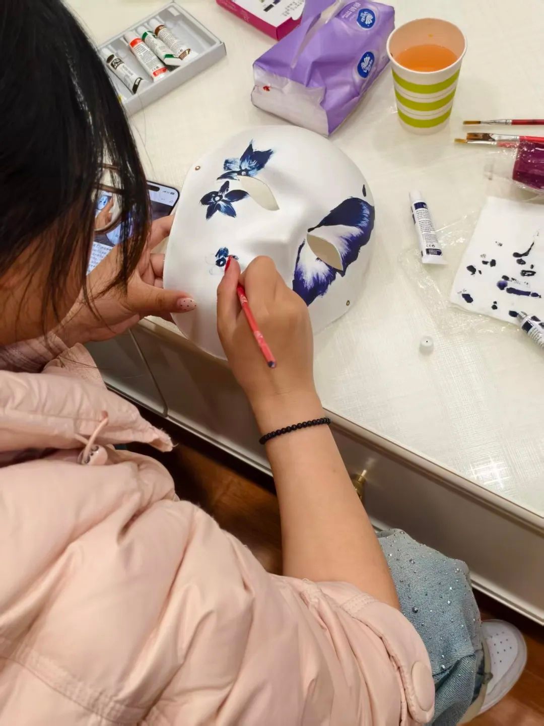 活动负责人为同学们备齐了空白面具、丙烯颜料以及画笔,简要介绍活动流程,鼓励大家通过艺术表达舒缓心情、认识自我,接着同学们便自由挑选材料,开始了创作。活动中,大家充分发挥想象力,全心投入,细心勾勒轮廓,专注于色彩的混合与碰撞。笔触之下,普通的白色面具逐渐焕发生机,变得独一无二:既有充满隐喻的抽象色块,也有细腻生动的具象图案。每一幅作品都承载着创作者独特的内心情感与思考。在轻松愉悦的气氛下,同学们自然而然地交流起创意灵感,互相欣赏作品,分享着执笔时的心绪变化。这不仅是一场手工创作,更是一次心灵的互动与彼此温暖的陪伴。