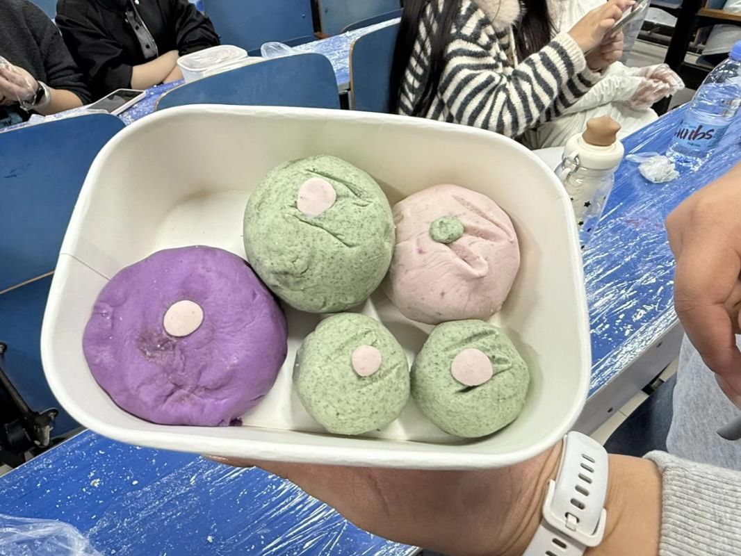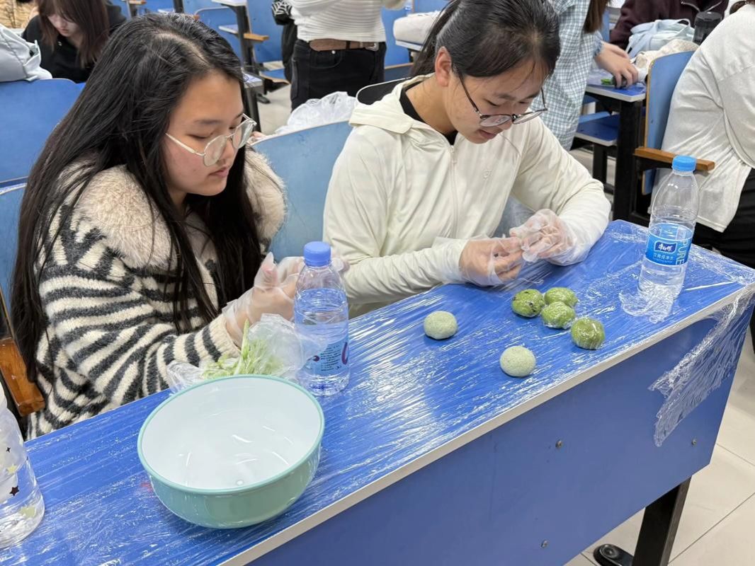 活动负责人首先详细介绍活动内容、目标及青团制作方法。随后分发原材料,请同学们按照各自的创意投入制作。大家两两协作,揉面、包馅、塑形,在创作过程中畅谈生活点滴,负面情绪在欢声笑语与指尖流动中悄然消解。一个个清香软糯的青团逐渐成型,既承载着春日暖意,也让同学们在沉浸式体验中收获了内心的平静与舒缓。制作完成后,大家现场品尝自己的劳动成果,在香甜的口感中感受手作带来的愉悦与成就感。
