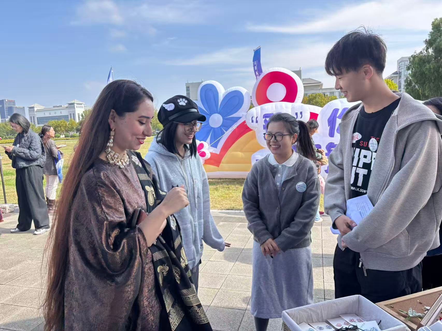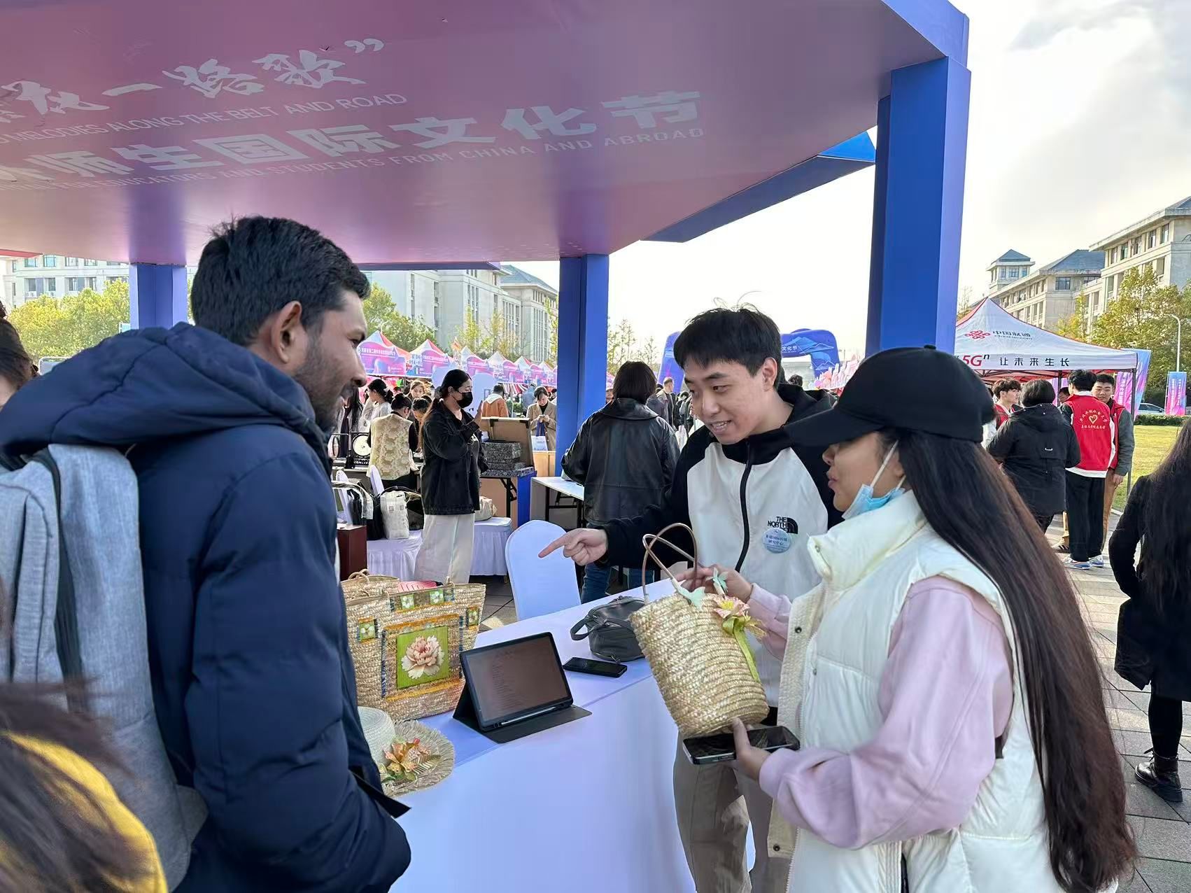 文化节现场,我院学子不仅是文化的传播者,更是创新的实践者。他们凭借流利的英语口语与扎实的跨文化交际能力,向来自各国的师生生动讲解蓝染、缠花、压花等中国非遗技艺,更成功将诸多非遗文创产品推介给现场观众,实现了从“文化展示”到“市场认可”的跨越,充分展现了我院商务英语专业在“应用型”人才培养上的扎实成效。